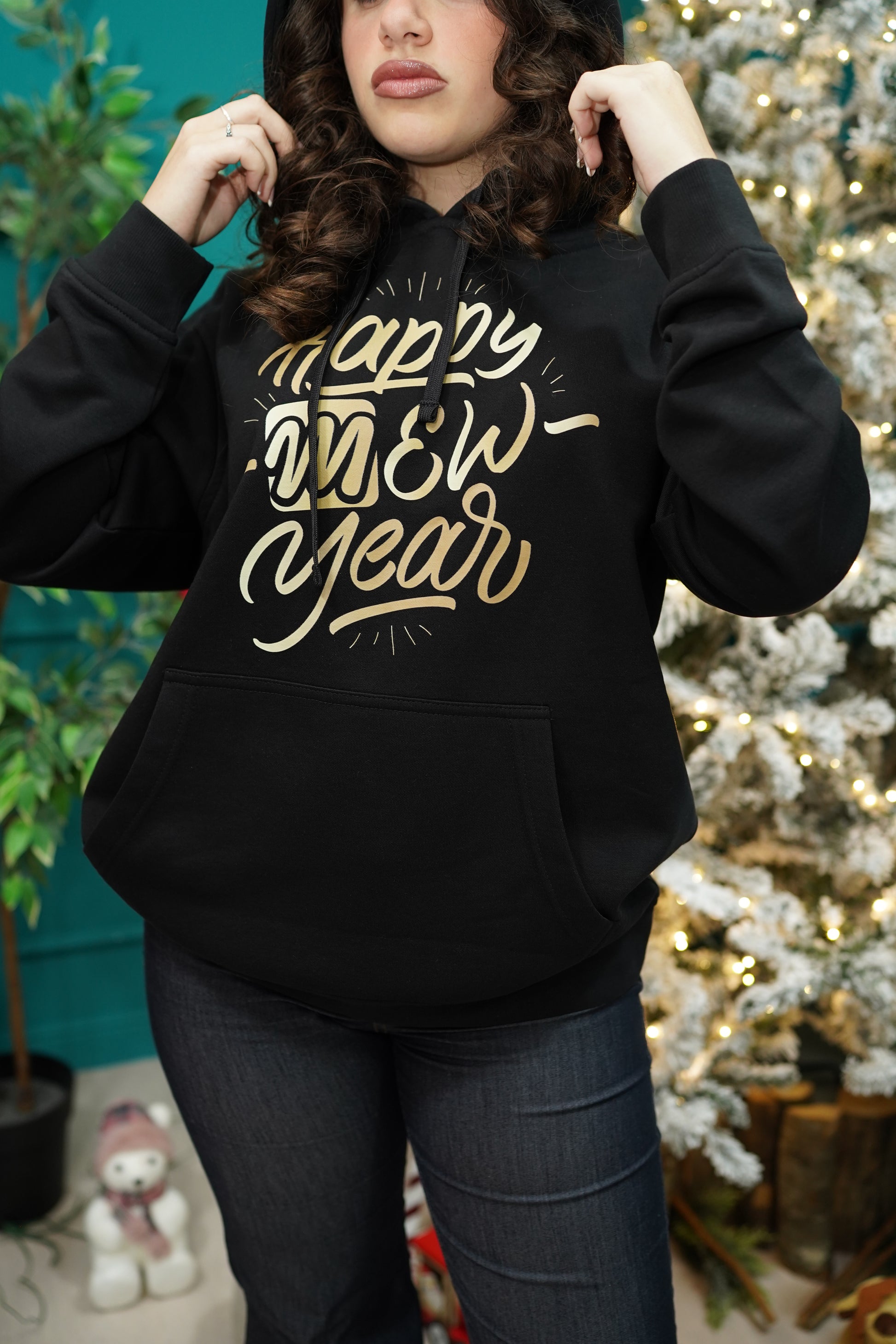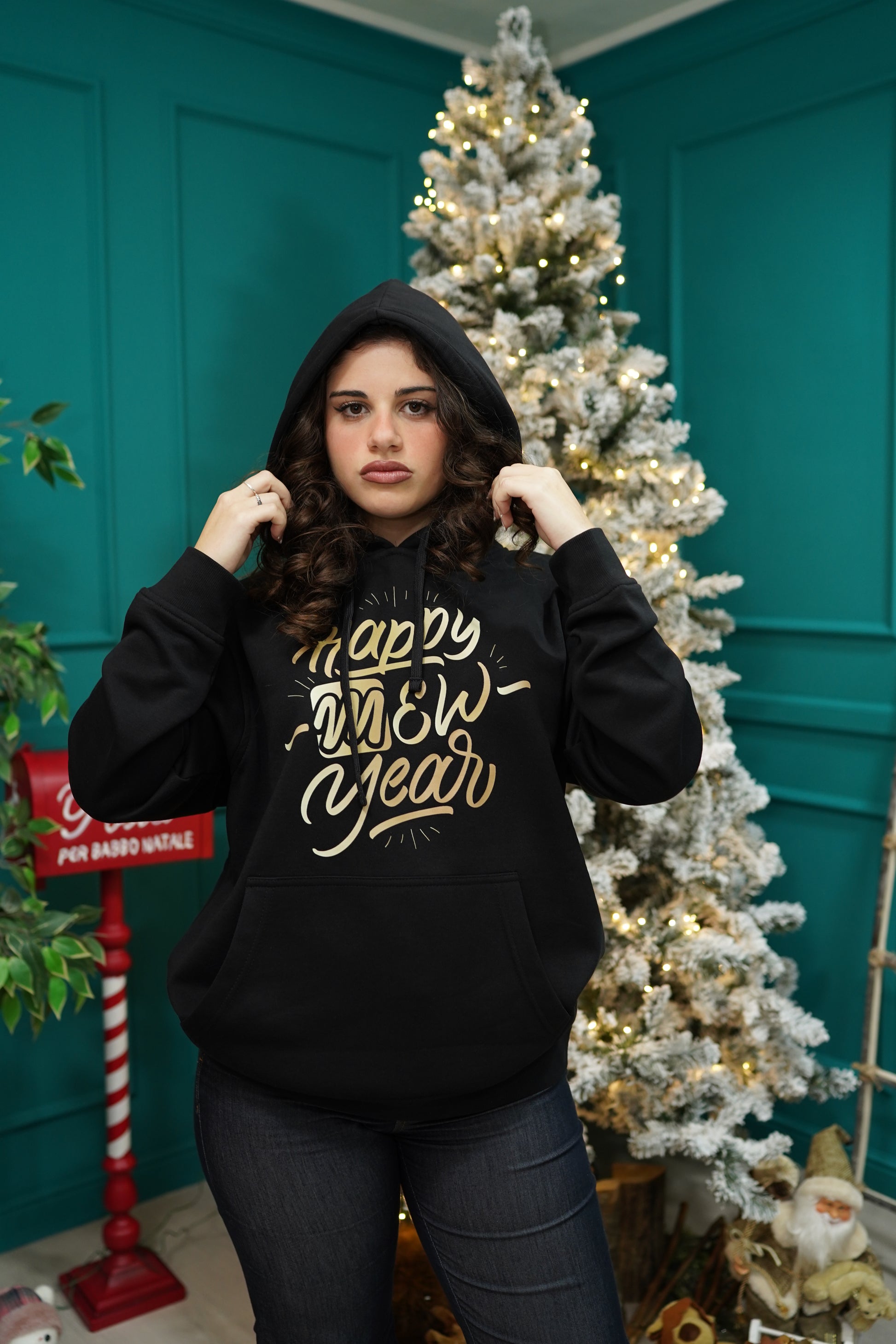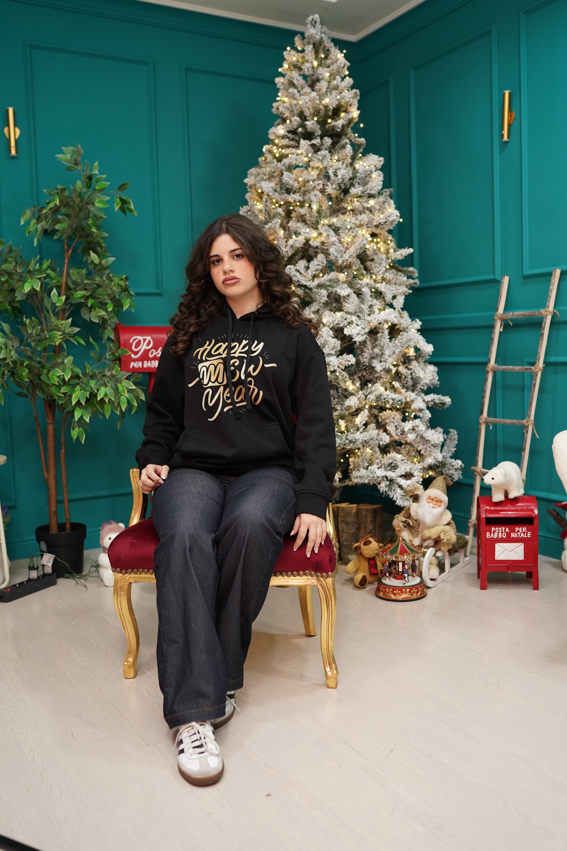 Una felpa con cappuccio pensata per accogliere il nuovo anno con stile. Morbida, calda e super confortevole, presenta una stampa “Happy Mew Year” in tonalità oro sfumate che la rende unica e perfetta per le festività. Il fit oversize aggiunge un tocco moderno e urban, ideale per chi ama i capi ampi e avvolgenti.