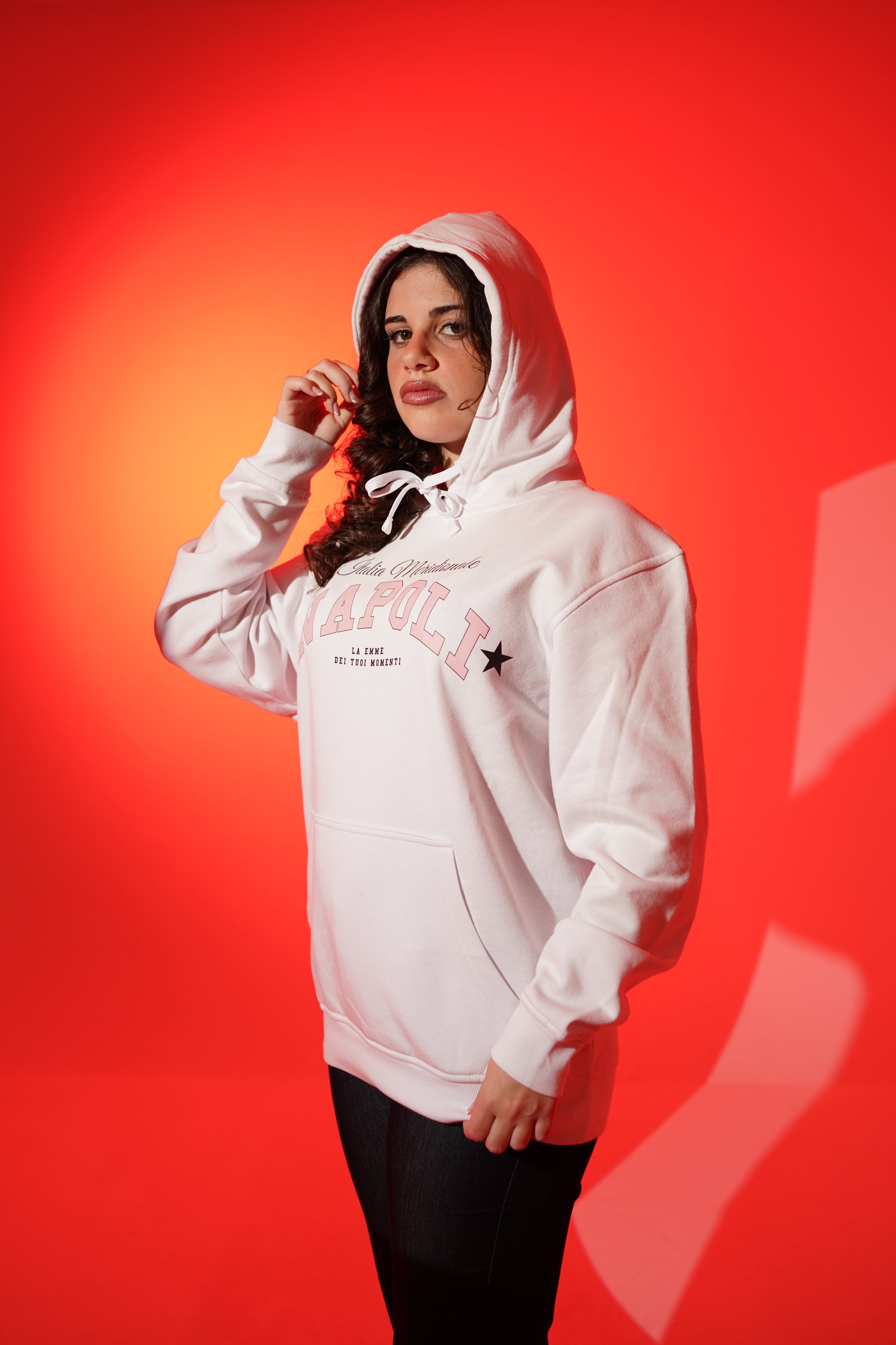 Una felpa dal carattere deciso, dedicata alla città di Napoli e ai suoi colori. La stampa in stile college con dettagli rosa e neri rende il capo moderno, mentre il fit oversize garantisce comfort e stile. Perfetta per chi ama l’identità, la tradizione e i capi che parlano da soli.